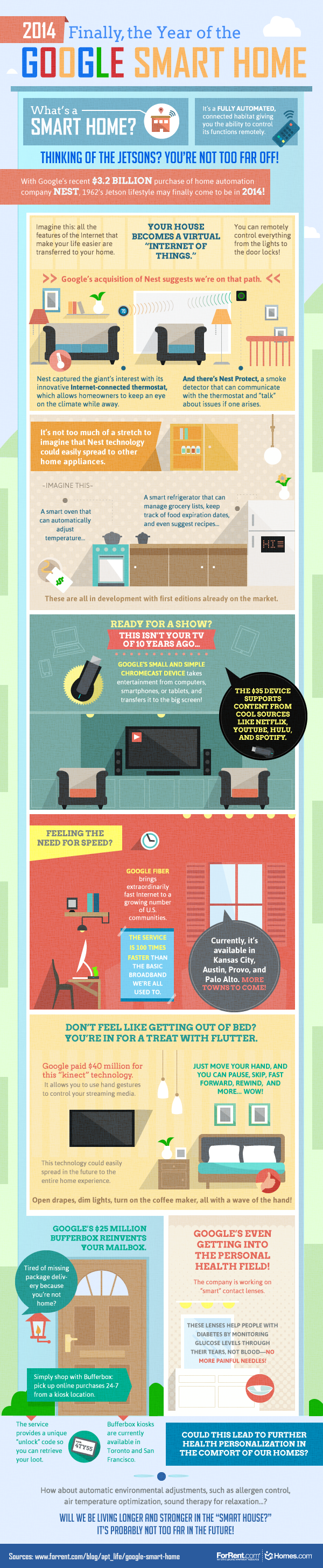 It’s hard to hear talk about a “smart home”—in essence, a fully automated, connected habitat that allows residents the ability to control its functions remotely—without thinking of that most clichéd of all space-age clichés: the Jetsons. However, with pioneering powerhouse Google’s recent $3.2 billion purchase of home automation device company Nest, the Jetson lifestyle envisioned by Hanna-Barbera in 1962 may finally be close to mainstream reality. Let’s put the pieces together and see what exactly might compose this dream house as built by Google.